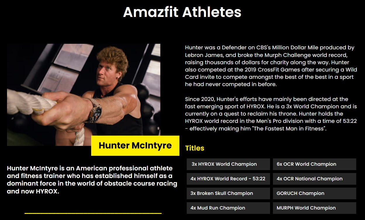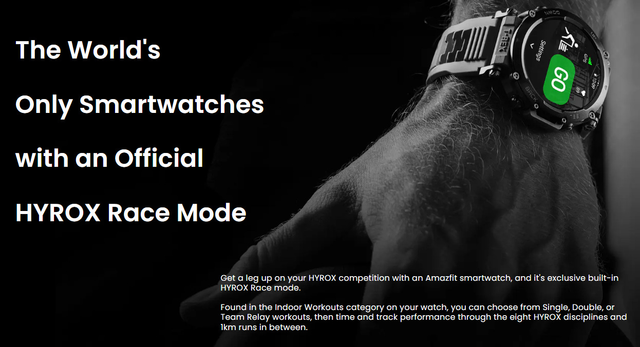 ต่อมา Amazfit ได้ไปจับกับกีฬาที่เติบโตอย่างรวดเร็วในตอนนี้ นั้นคือ HYROX เป็น Official Partner ปี 2024 - 2026 สินค้าของ Amazfit สามารถ Tracking Hyrox ได้ดีที่สุด และยังเป็น Partner กับแชมป์โลก Hyrox อีกด้วย