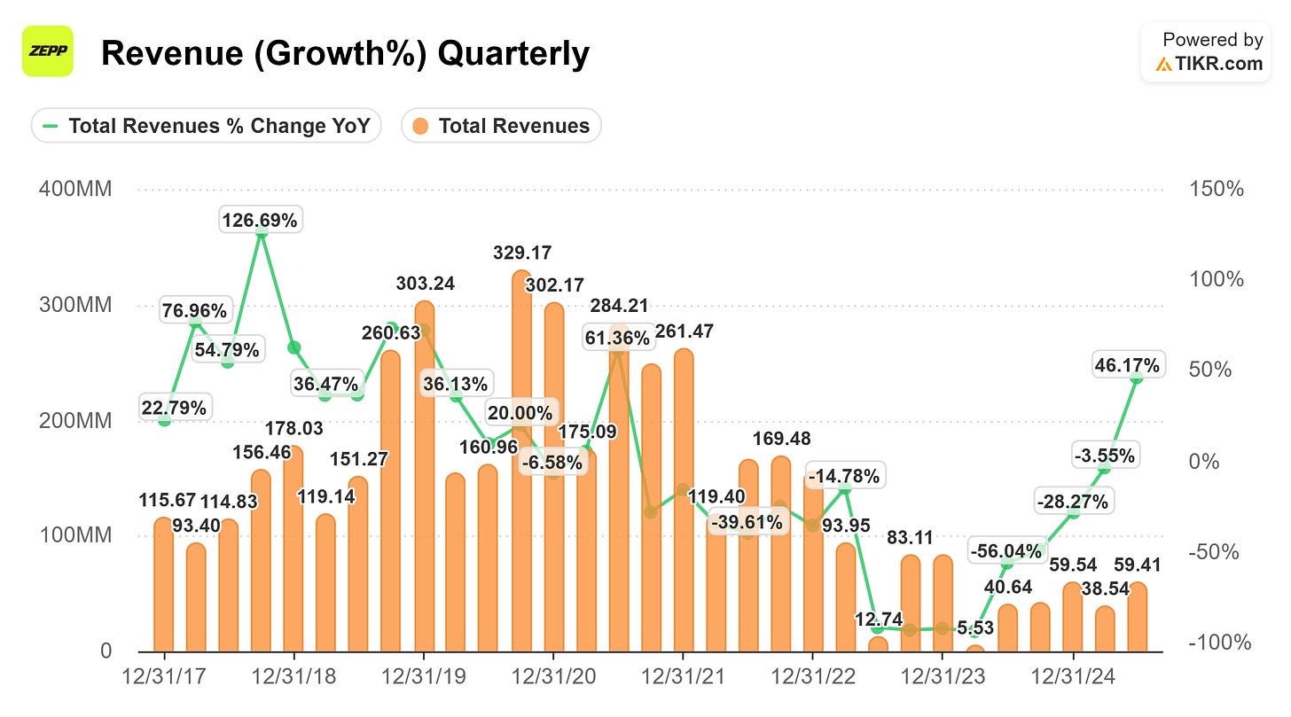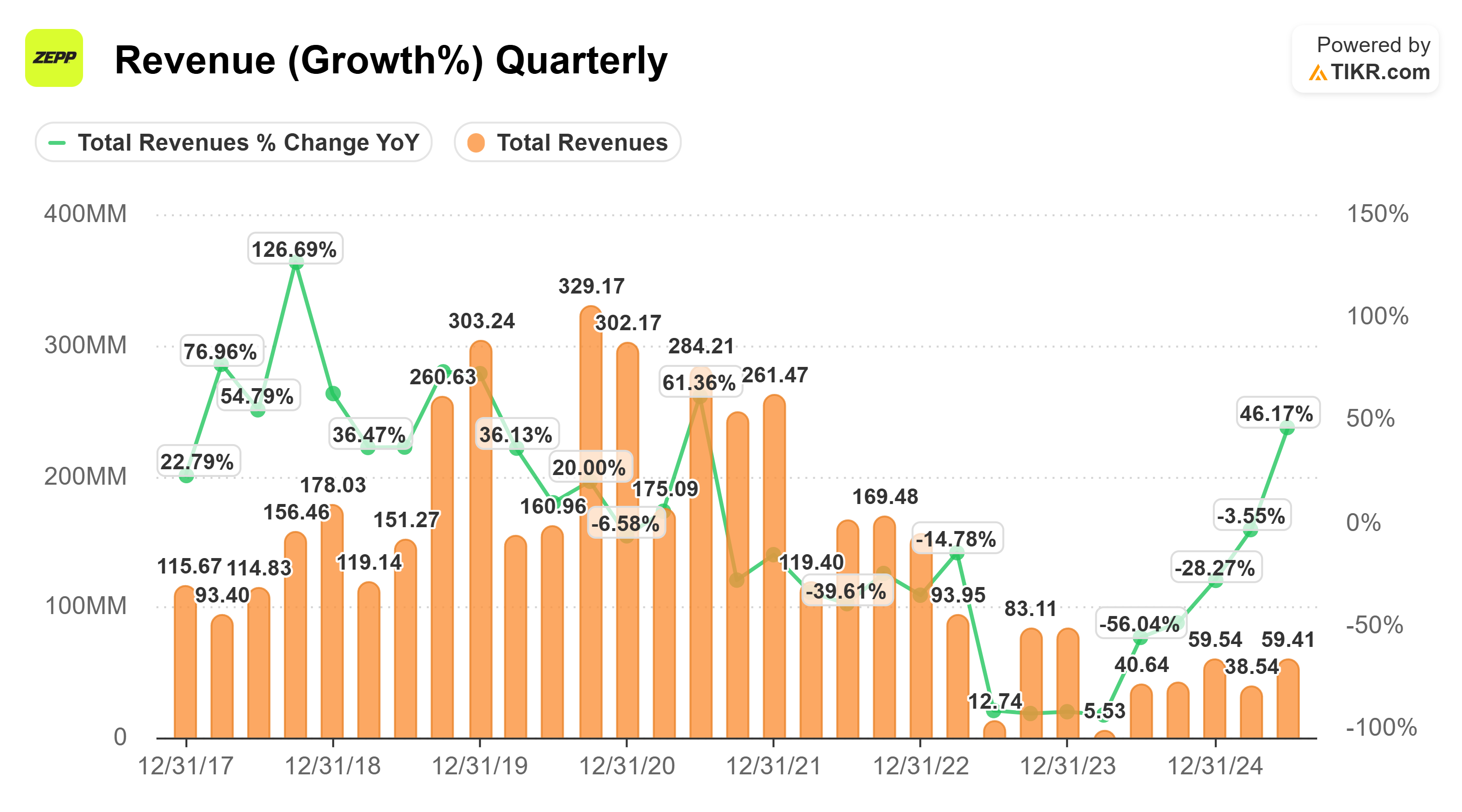 ลองดูที่การเติบโตของรายได้จะเห็นว่า รายได้ยังติดลบเทียบกับปีก่อนหน้าอยู่ใน Q1 25 แต่ลบน้อยลงมาก และมีแนวโน้มที่ดีขึ้นอย่างชัดเจน และเมื่อดูไส้ในจริงๆก็จะเห็นว่ารายได้ของแบรนด์ Amazfit เดี่ยวๆ เริ่มกลับมาเติบโตอีกครั้งใน Q1 25 ถือเป็นสัญญานที่ดี แต่ตอนงบ Q1 25 ออกมาราคาหุ้นก็ยังไม่ขึ้นนะครับ มาดูกันต่อว่าเกิดอะไรขึ้น