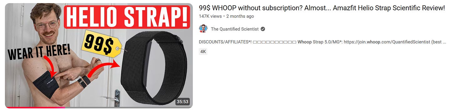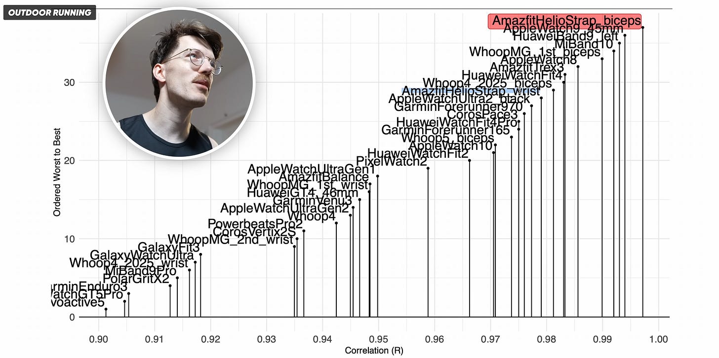 ข้อมูลจากช่อง The Quantified Scientist ซึ่งเป็นหนึ่งในช่องรีวิวอุปกรณ์ Tracker ต่างๆ ที่เอามาเทียบๆกันว่าตัวไหนวัดค่าได้ตรงที่สุด และจัดลำดับ ข้อสังเกตุที่น่าสนใจคือ Amazfit Helio Strap สามารถวัด Heart rate ได้ดีที่สุดในทุกอุปกรณ์ ในหมวด Outdoor running!!! แต่ต้องใส่ที่แขน ถึงแม้ใส่ที่ข้อมือก็ยังอยู่ในลำกับที่ดีมากๆ จากแบรนด์ที่อาจมองว่าคงวัดอะไรไม่ได้ดีเท่าแบรนด์ดังๆ แต่จากรีวิวต่างๆที่ผ่านมา จะเห็นได้เลยว่า รุ่นใหม่ๆที่ออกมาของ Amazfit ไม่ได้ด้อยไปกว่าแบรนด์ดังๆเลย