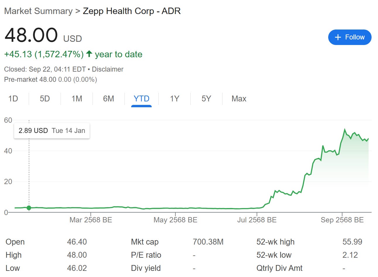 เรียกน้ำย่อยกันก่อนด้วยราคาหุ้น Zepp ที่ขึ้นมาแล้ว15 เท่า!! จาก 3$ มา 48$ ในระยะเวลาเพียง 3 เดือนเท่านั้น!!